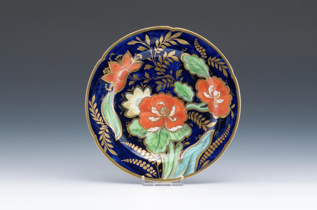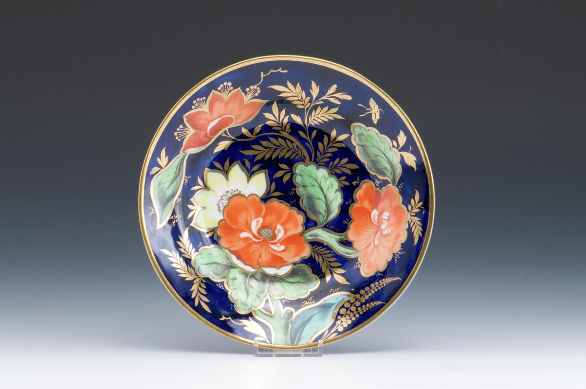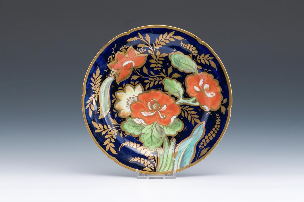 Bread plate, greyish-blue hard-paste porcelain, with a slight brownish translucency, standing on a shallow foot rim, plain everted rim; decorated with an underglaze blue ground reserved with two red peonies and a red and yellow flower amid naturalistically painted foliage, the edges lined in gold, and with gilt sprays of leaves; narrow gilt band at the rim.