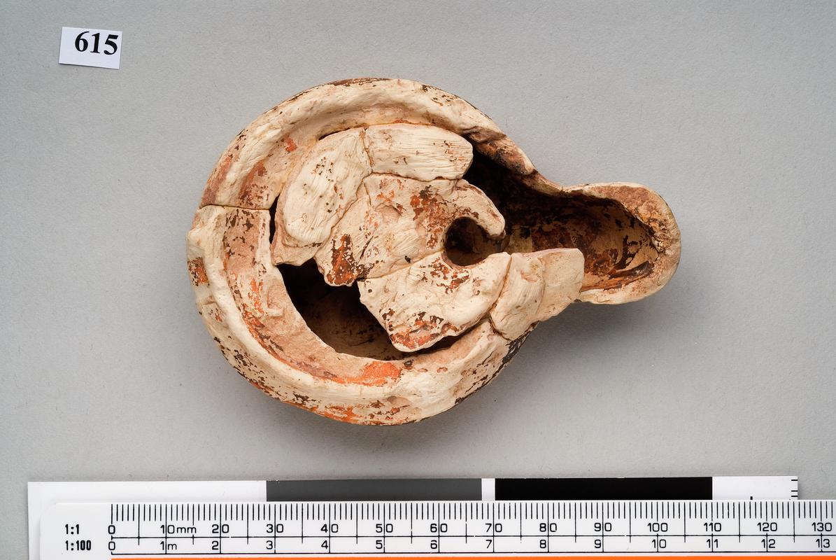 Workmen unearthed this stone coffin in 1996 when digging foundations for new houses. The coffin contained an incomplete skeleton. Anatomical analysis suggests that it is probably a woman, who was 1.62 meters (5 feet 4 inches) tall and between twenty-five and thirty-four years old. A radiocarbon date from one of the bones indicates that she died in the latter half of the third or fourth century AD. The stone coffin suggests that she came from a wealthy family - the use of Bath stone, brought in from the other side of the River Severn, would have added to the expense. Inhumation burial like this had not always been usual in Roman society. Until the late 2nd century AD, cremation was the most common burial practice throughout the Empire. Changing attitudes, notably the spread of beliefs in bodily resurrection, led to a shift in burial practice from cremation to inhumation.