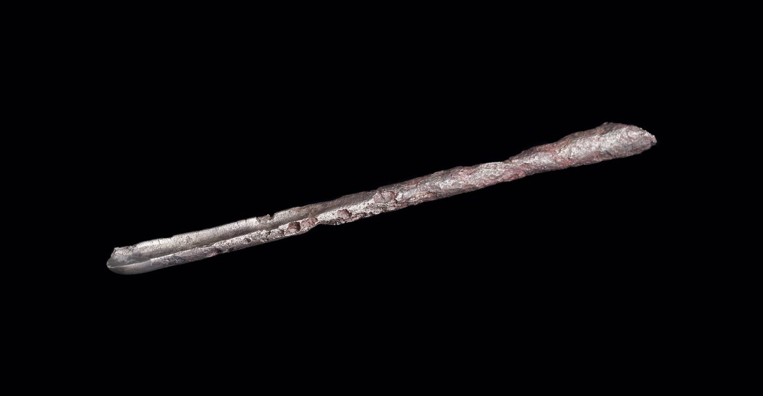 Iron socketed axe or cleaver, with triangular blade, and tapering open socket with a pyramid-headed nail at the base. The metal of the blade and soket showed wood and leather associations.