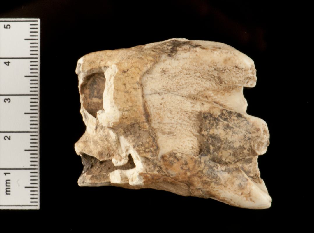 A complete upper molar of a woolly rhinoceros. The ends of the roots are missing. There is sediment adhering to the tooth.