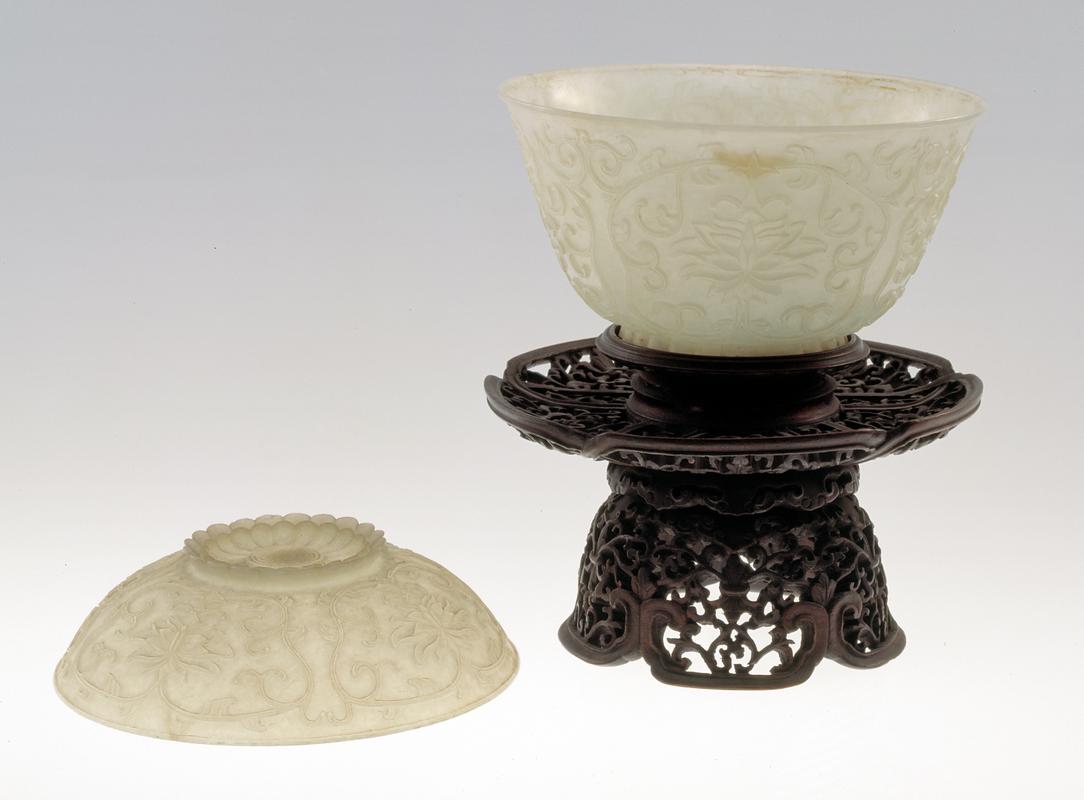 Bowl, jade, dark green with separate pierced top; the handles of the bowl are formed as flowers with suspended loops below, including a wooden stand.