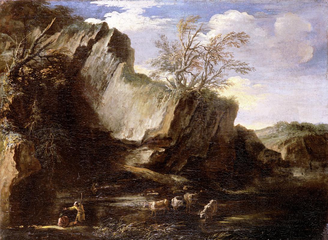 Mae heusor a'i wartheg yn oedi wrth lannau'r afon Rhein, wrth i fonheddwr farchogaeth tuag ato'n araf. Yn y pellter, mae amlinell aneglur Castell Ubbergen. Roedd y castell yn y cefndir, a ddymchwelwyd ym 1712, ger Nijmegen ar Afon Rhein. Roedd y castell yn symbol o wrthryfel yr Iseldirwyr yn erbyn byddin Sbaen ac yn ennyn cryn falchder cenedlaetholgar. Cafodd Cuyp ei hyforddi yn Dordrecht ac roedd yn weithgar yno. Roedd yn un o brif beintwyr tirluniau'r Iseldiroedd yn yr 17eg ganrif. Er nad aeth Cuyp erioed i'r Eidal ei hun, mae goleuni euraidd yr Eidal yn tywynnu o'i dirluniau, sy'n debyg i'r hyn a welai yng ngweithiau ei gyfoedion oedd wedi teithio yno. Oherwydd ei dirweddau bryniog mewn golau euraid, gelwid ef yn 'Claude yr Iseldiroedd'. Mae'n debyg fod y darlun hwn yn perthyn i ganol y 1650au ac yr oedd eisoes ym Mhrydain erbyn y 18fed ganrif.