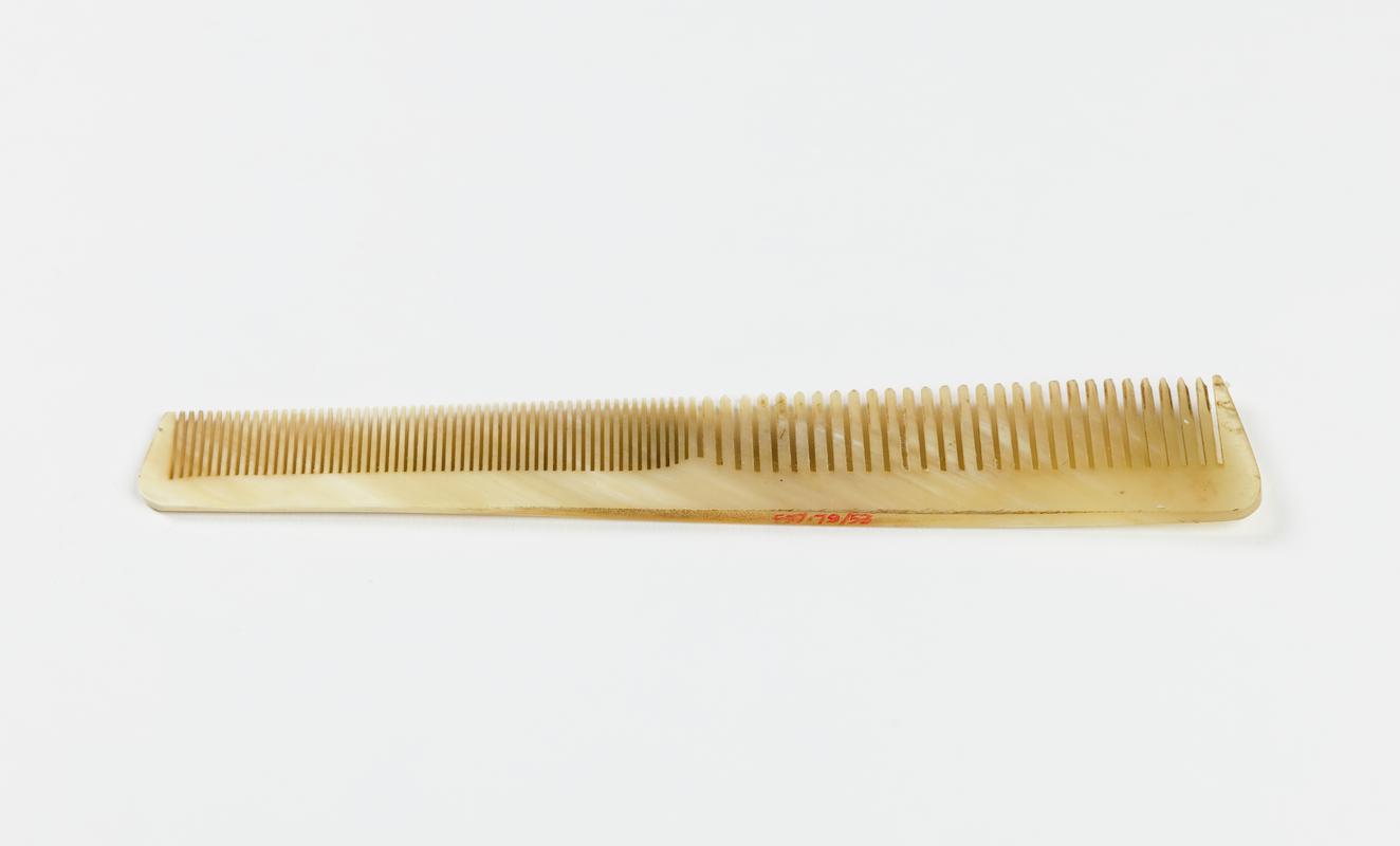 Very flexible, thin black plastic tapered Wahl comb with straight back and two cuts. From W. T. Bates, barber shop, 3 Bridgend Road, Llanharan.