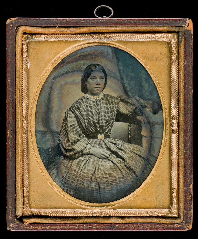 Portrait of a woman. Colour has been added to the woman's cheeks and gilt to her belt clasp and jewellery. In frame.