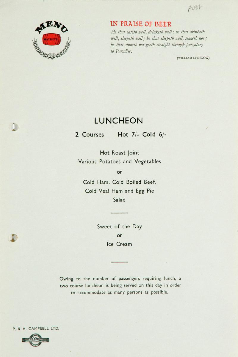Green print on cream card with a colour drawn picture of a duck and birds at top with the words 'Guinness is good with meals' printed above. Dated September, 1960.