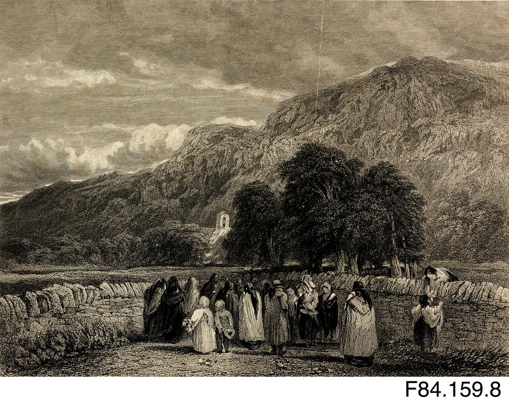 Coloured aquatint by W. H. Pyne, dated 1808. It is similar to that which appears in his book 'British Costumes' showing Welsh women washing clothes on stones by a river. One woman is using a washing bat, wearing blue apron, blue and white striped gown and white cap; the other is wearing a buff skirt and blue short gown, with red kerchief and brown hat.