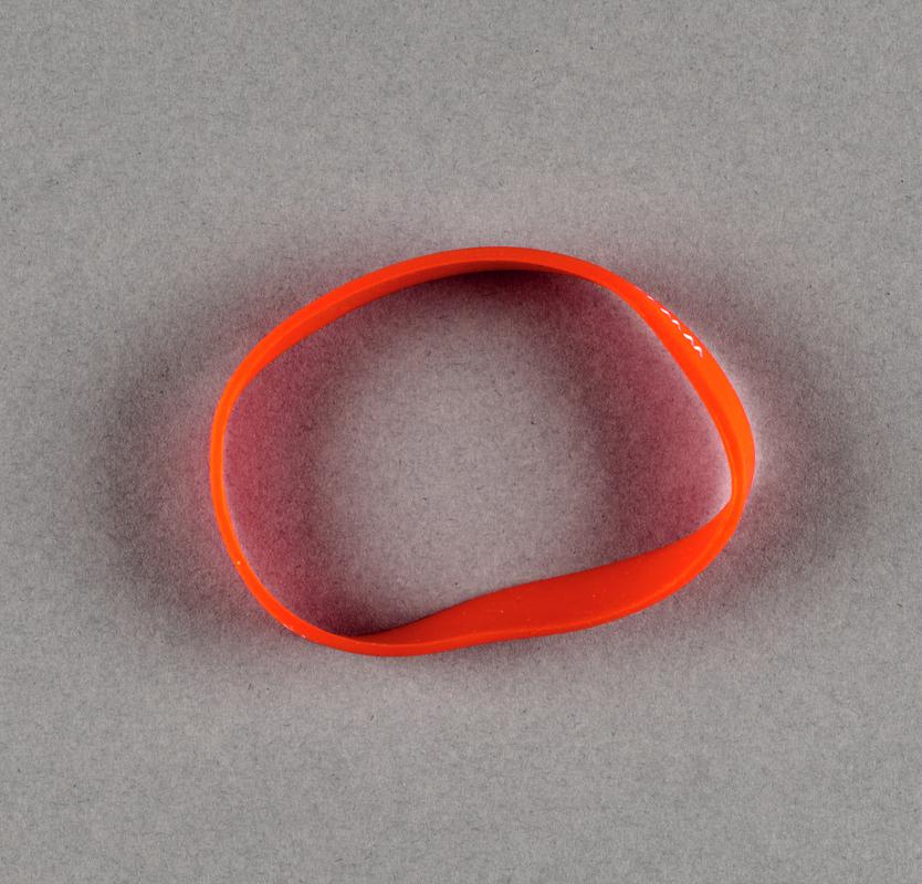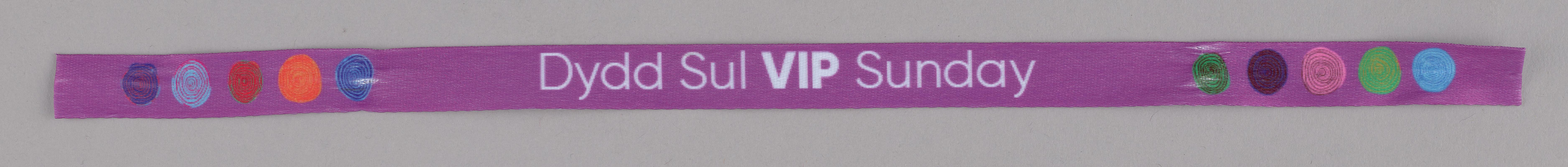 Rainbow coloured wristband. Made form elastic plastic, the words 'PLISMONA GYDA BALCHDER / POLICING WITH PRIDE' are printed along the outer circumference of the wristband. Collected at Abergavenny Pride, 24 June 2023.