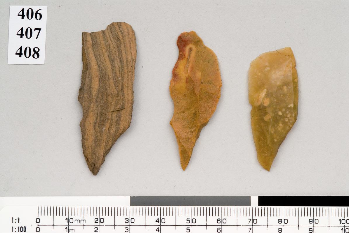 A white patinated obliquely backed point. The retouch is on the left hand edge. The distal termination has been snapped, this is an ancient break.