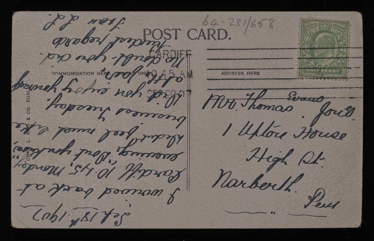Black and white postcard of "Pembroke Castle, Courtyard". Sent to Mr Tom Jones of Gowerton. Postmarked 22 November 1914.