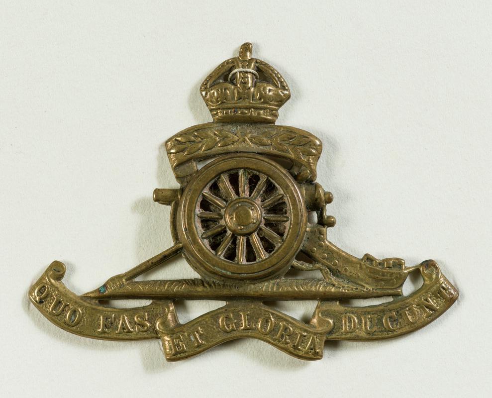 Brass cap badge of Royal Engineers with emblem of initials GR inside belt with crown above, surrounded by wreath