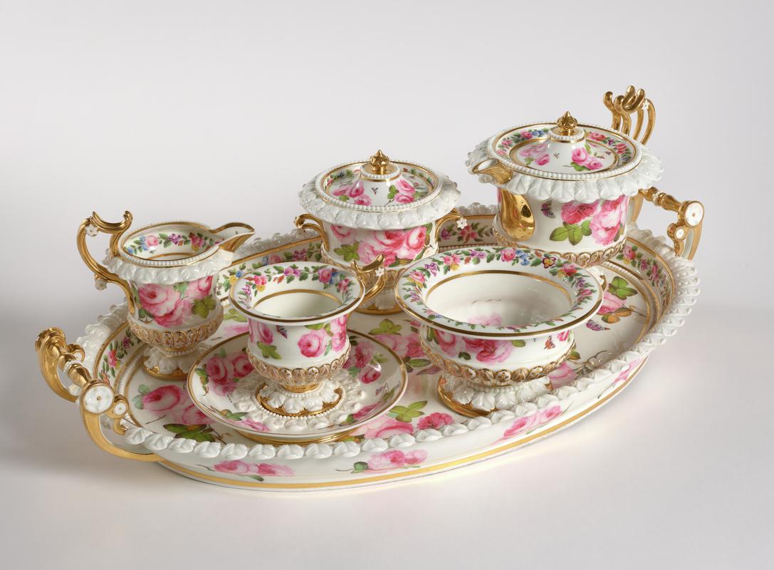 Teapot, rectangular, soft-paste 'duck egg' porcelain; standing on a rectangular straight sided foot rim, bulbous body waisted at base, everted shoulder and curved collar; spout with scallop moulding at base and moulded scrolls at the top; high wishbone handle with an inner closed loop; plateau-shaped lid with a grooved pyramid finial; transfer printed scenes in grey enamel on either side of the body and cover; on one side a country house with formal gardens, on the other, five children with their nurse, playing with a cart and a dog; black enamel bands to the rims, finial and collar, and detailing on the spout and handle.