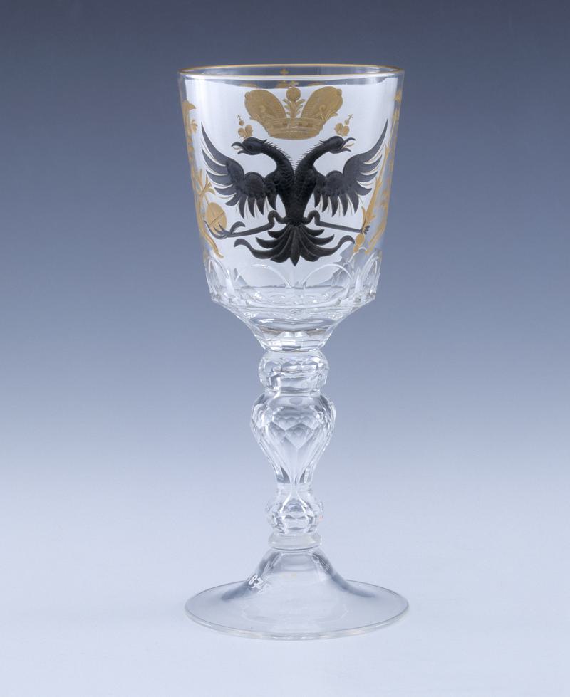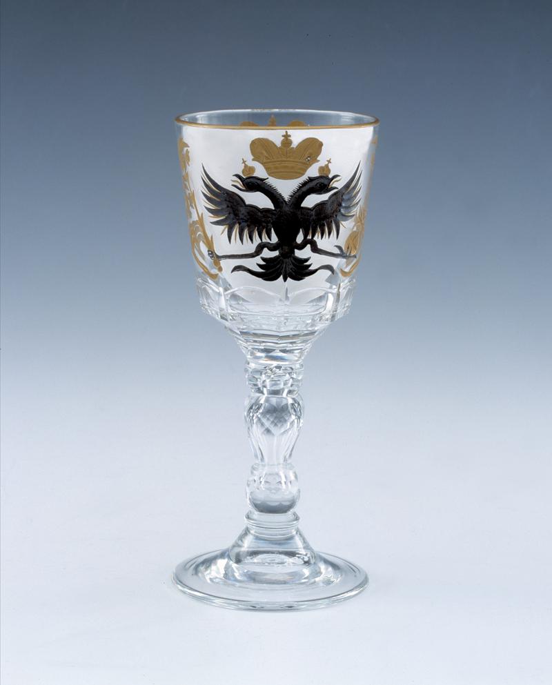 Drinking glass, plain domed foot, short waisted baluster stem cut into diamond facets, high conical flute-shaped bowl cut with oval facets around the base, the bowl wheel-engraved with to one side the Russian Imperial Double Eagle surrounded by foliage and to the other side the Imperial Monogram of Tzar Nicolas II, enclosed by a cartouche of banners and a crown, the wheel-engraving filled-in with black enamel and gilt.