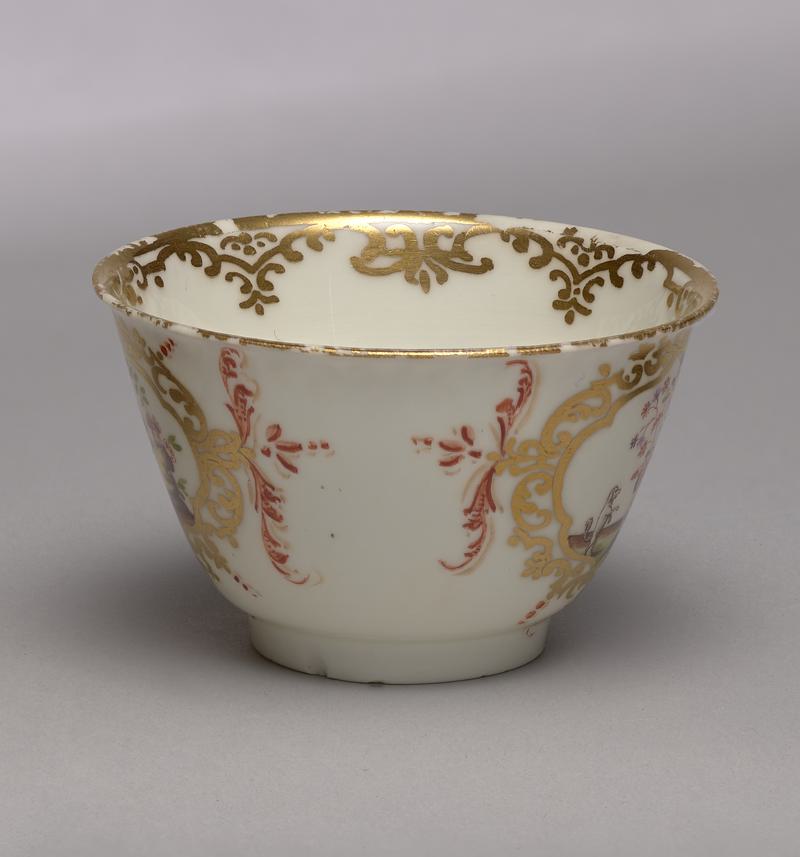 Earthenware sugar bowl, Kestrel shape, conical bowl, sides curving outwards, upper sides almost vertical. Light honey coloured glaze. Four narrow graduated black enamel bands around base of bowl, broadest at bottom, interior of bowl entirely banded Tango orange.
