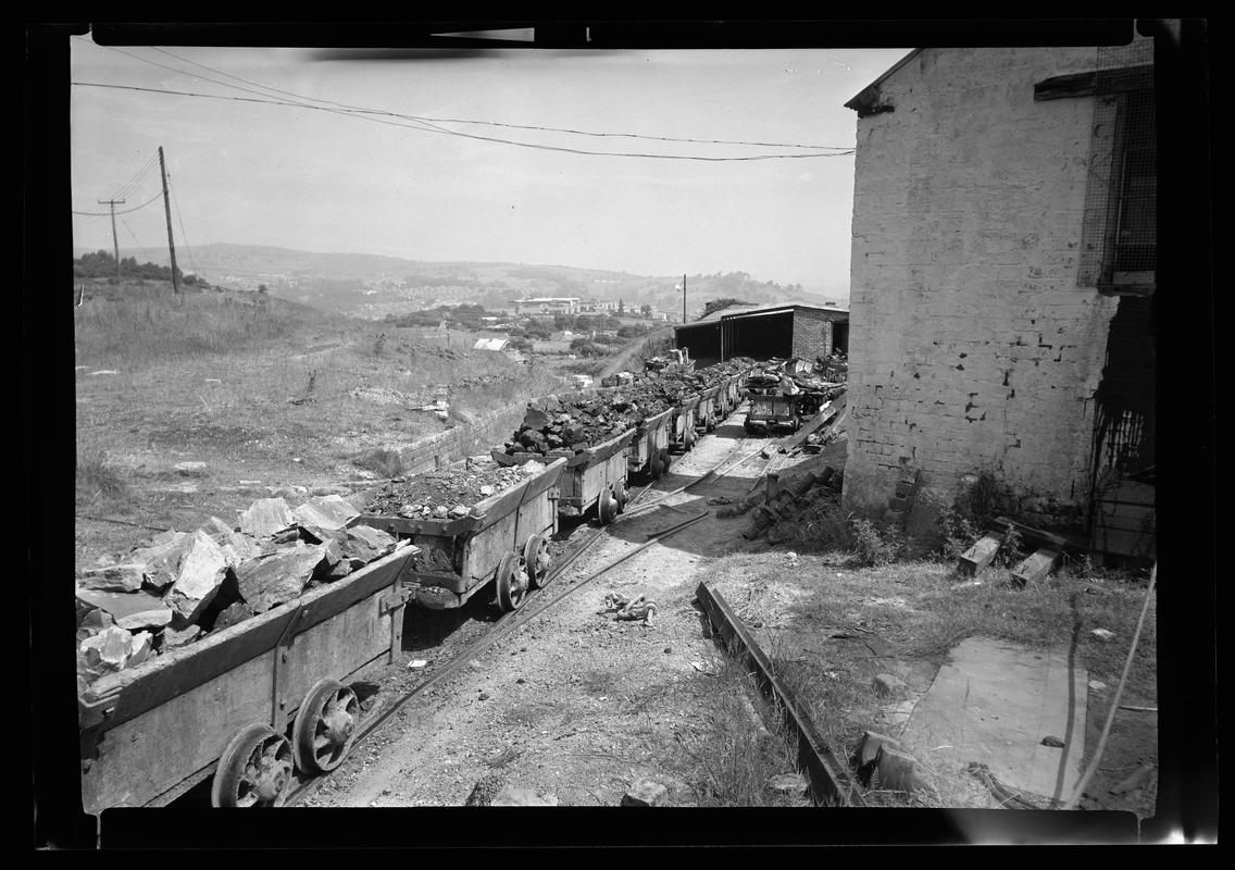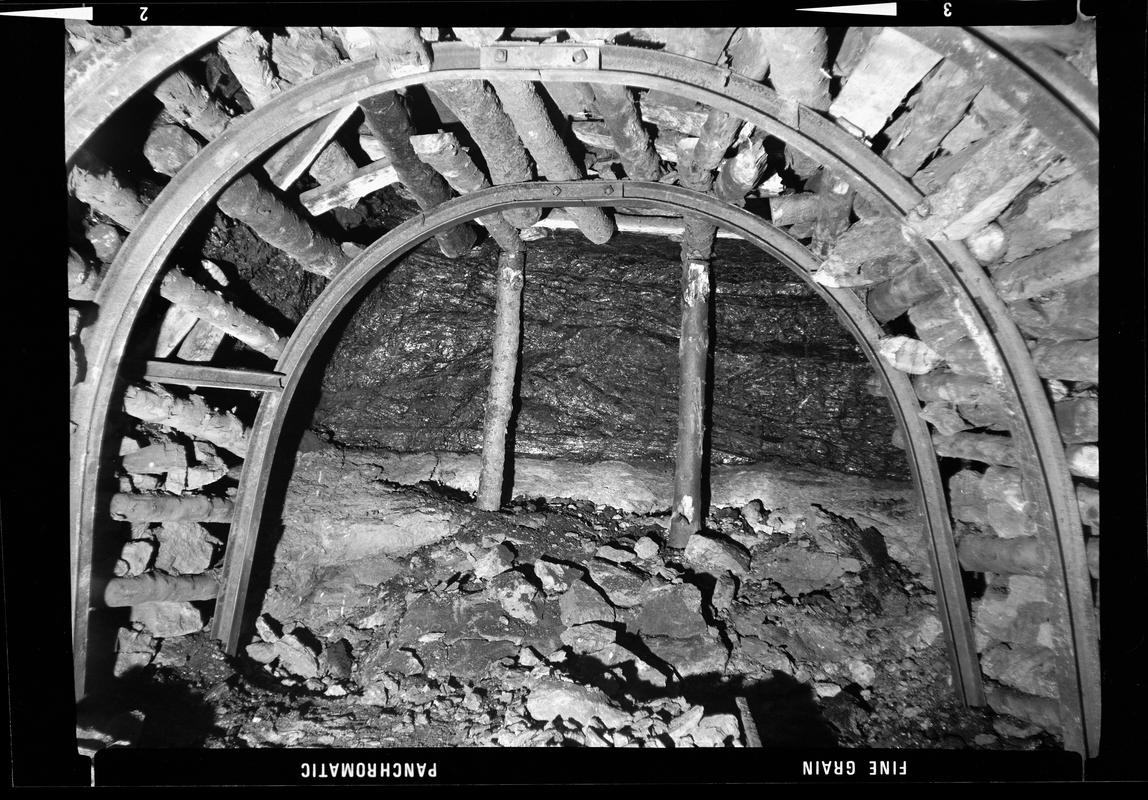 Negatif ffilm du a gwyn yn dangos cilfach ffan Sirocco yng Nglofa Blaendare.
