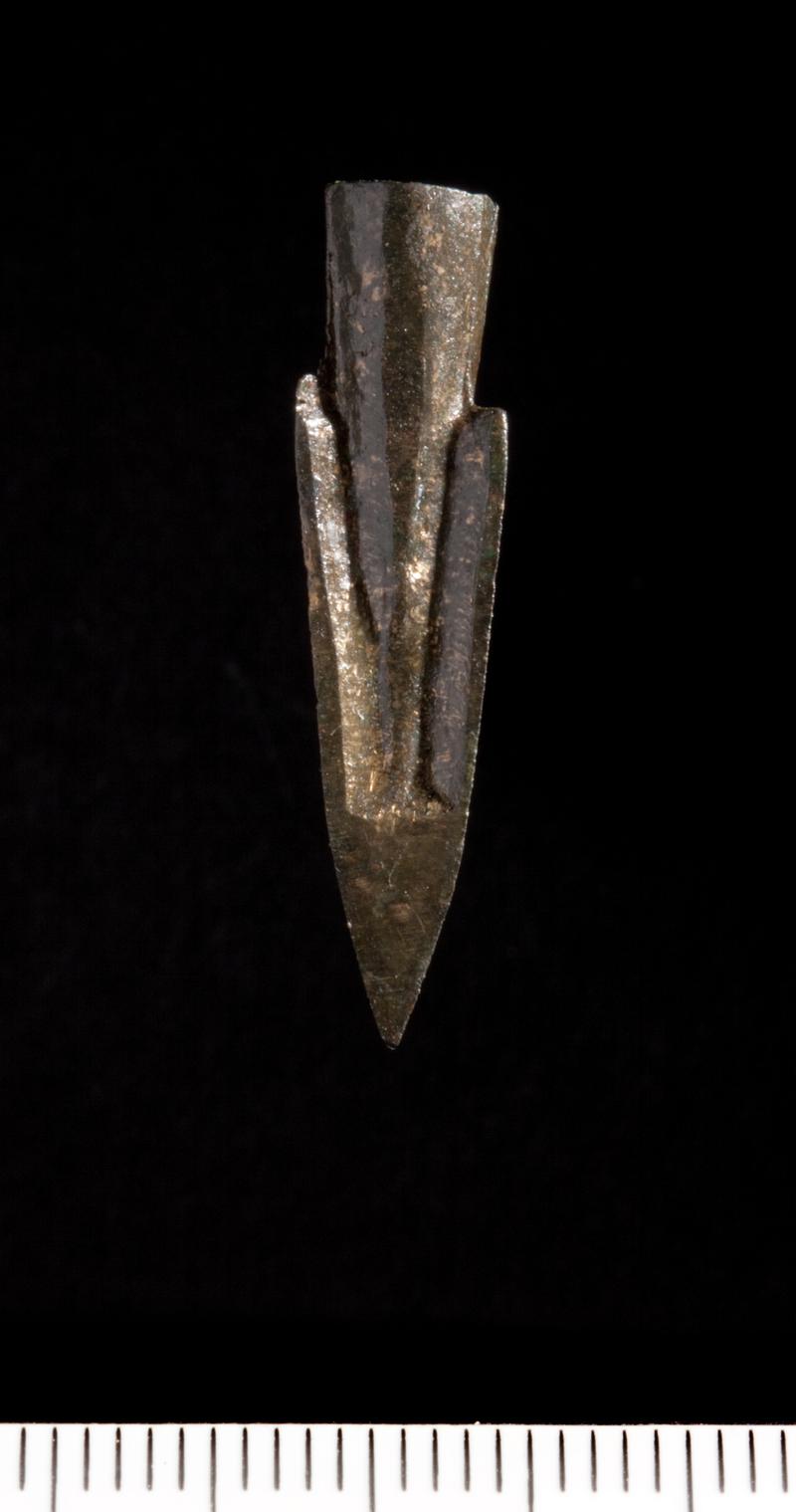 Arrowhead with long narrow barbs and broad triangular head. Probably for use in hunting.