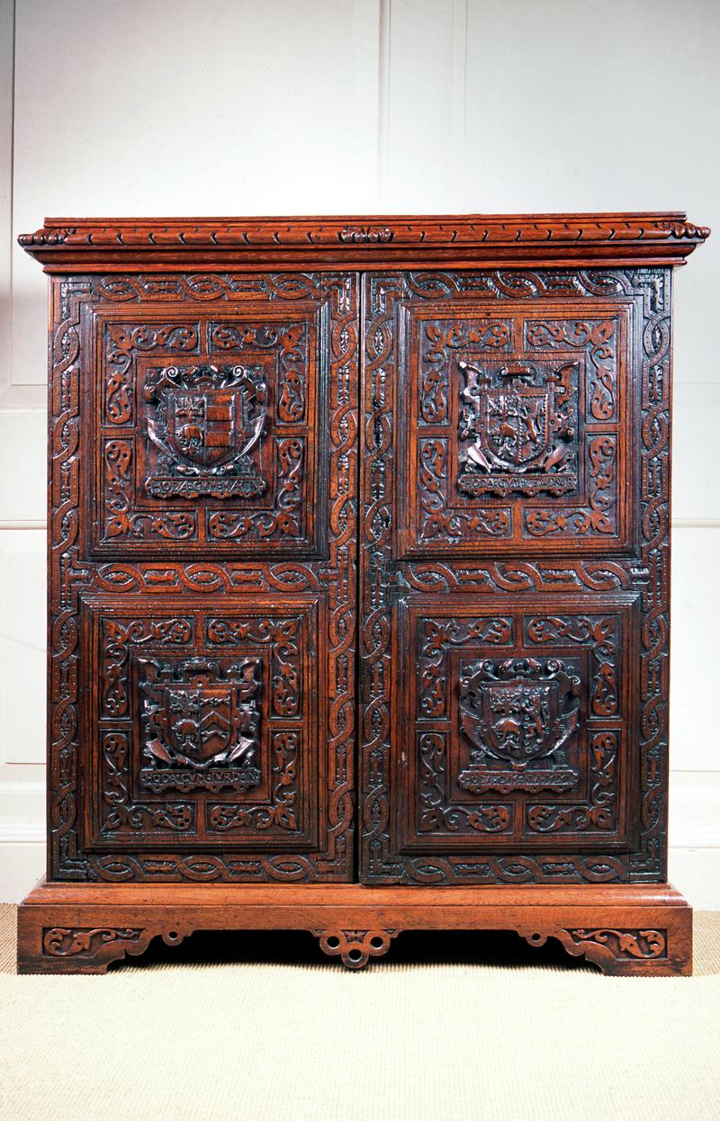 Stained wooden cabinet; two doors, inlaid with beaten copper plaques with floral motif; internal fittings include an earthenware tobacco jar, lidded; drawers (for matches etc) and pipe racks.