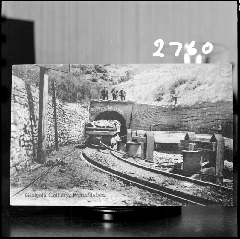 Negatif ffilm du a gwyn yn dangos Goruchwyliwr yn archwilio llafnwr ar y Wythien Chwe Throedfedd, Glofa Brynlliw, 15 Rhagfyr 1977.