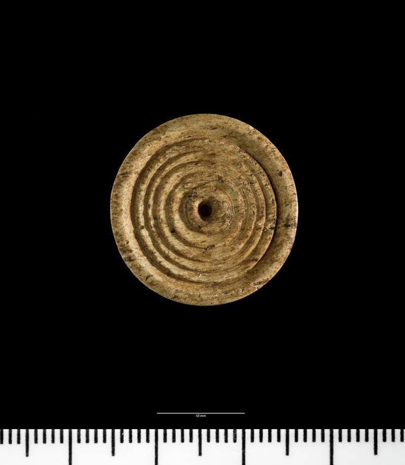 Chessman, cylindrical antler tine chessman. Circumferential ornament of ring-and-dot and incised lines, a more detailed examination is not possible from the fragments.