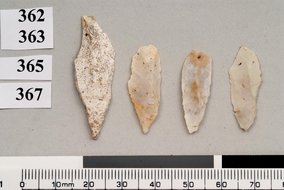 Late Mesolithic microlith of scalene triangle form with retouch on leading edge made of flint.