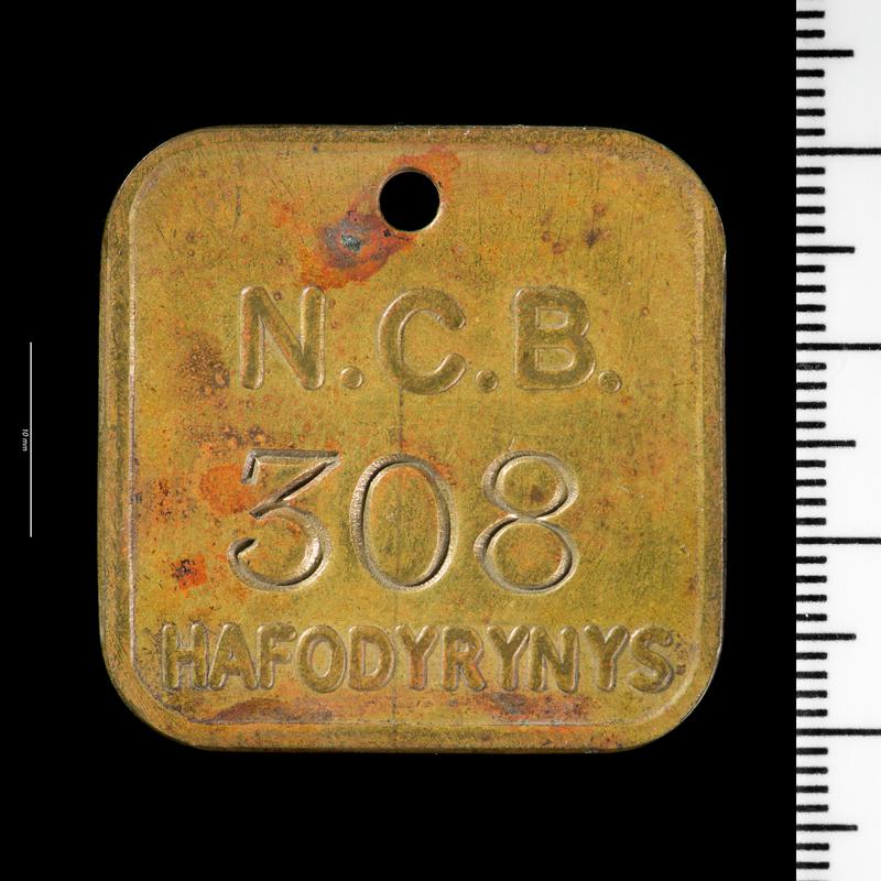 Circular brass lamp check with inscription on obverse side only and hole at top.