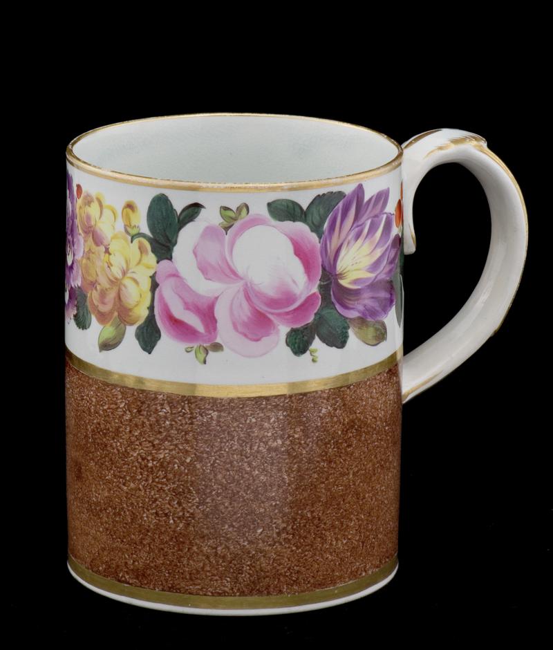 Pearlware mug, straight, slightly tapering side. Handle with moulded acanthus leaf spur and gilt decoration. Gilt bands to upper and lower rims. Sprays of gold flowers either side of a central medallion, depicting a young girl at an open window picking grapes from a vine outside - painted in brown, purple, green and grey enamels. Medallion bordered with overlapping printed ovals, each with three vertically arranged dots inside.