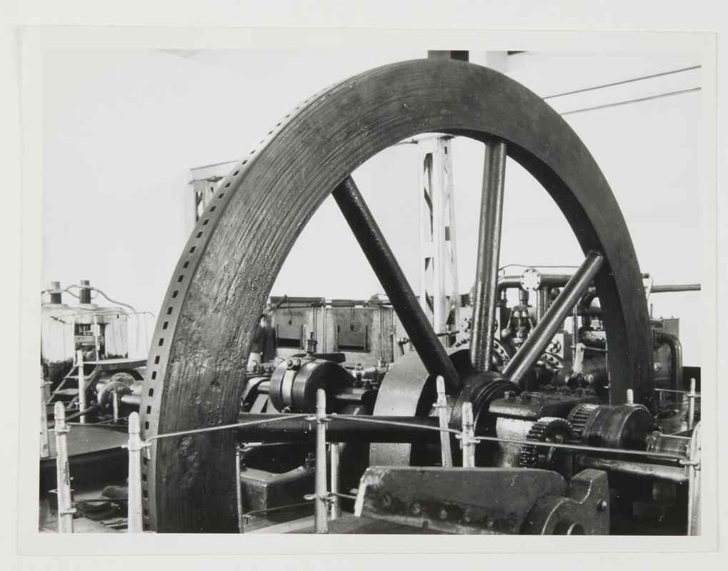 Photograph showing a scale model of a cross compound steam engine used to drive two mills at the Eaglesbush Tinplate Works, Neath. Photograph taken at Trostre Works Museum. Photographer's stamp on back.
