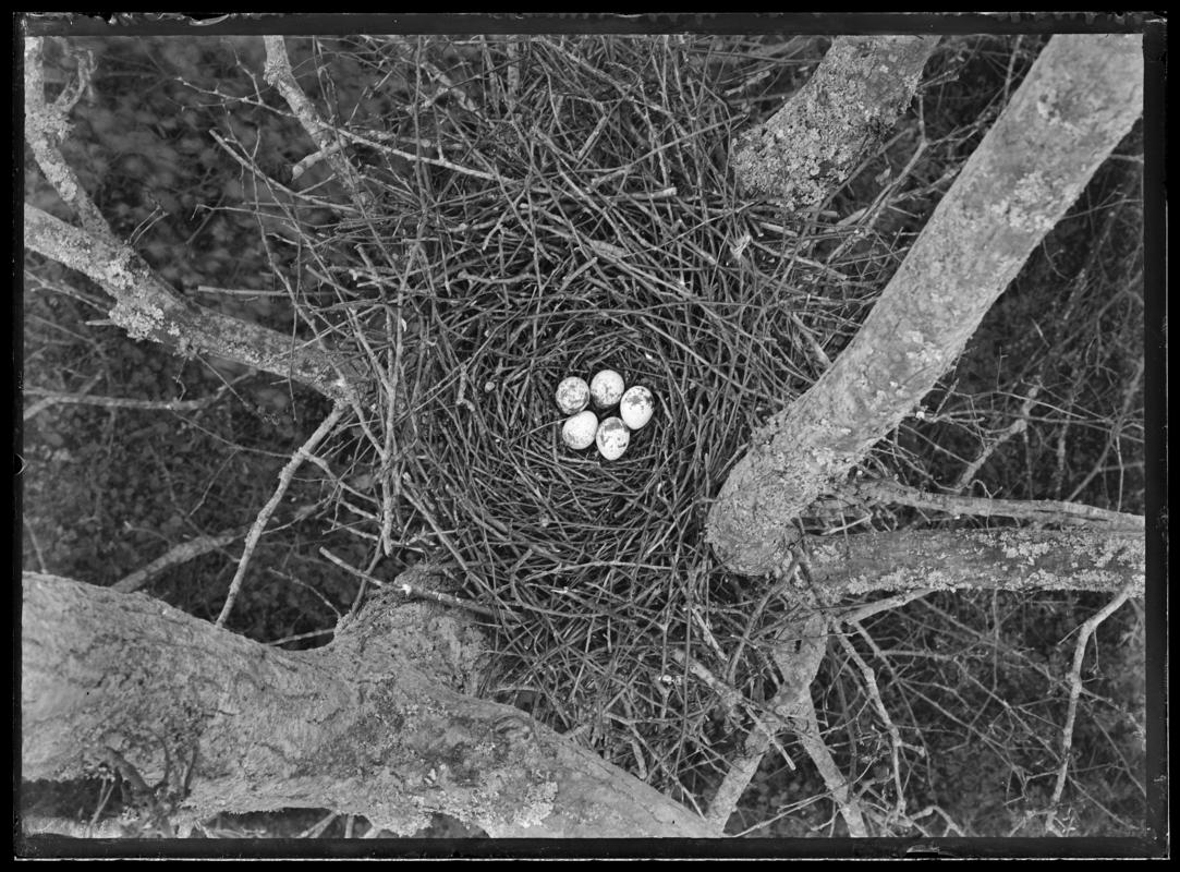 Young Sparrowhawks (Accipiter nisus) in nest with eggs, in Weston. Photographed 20 June, 1911. Exposed at f/16.