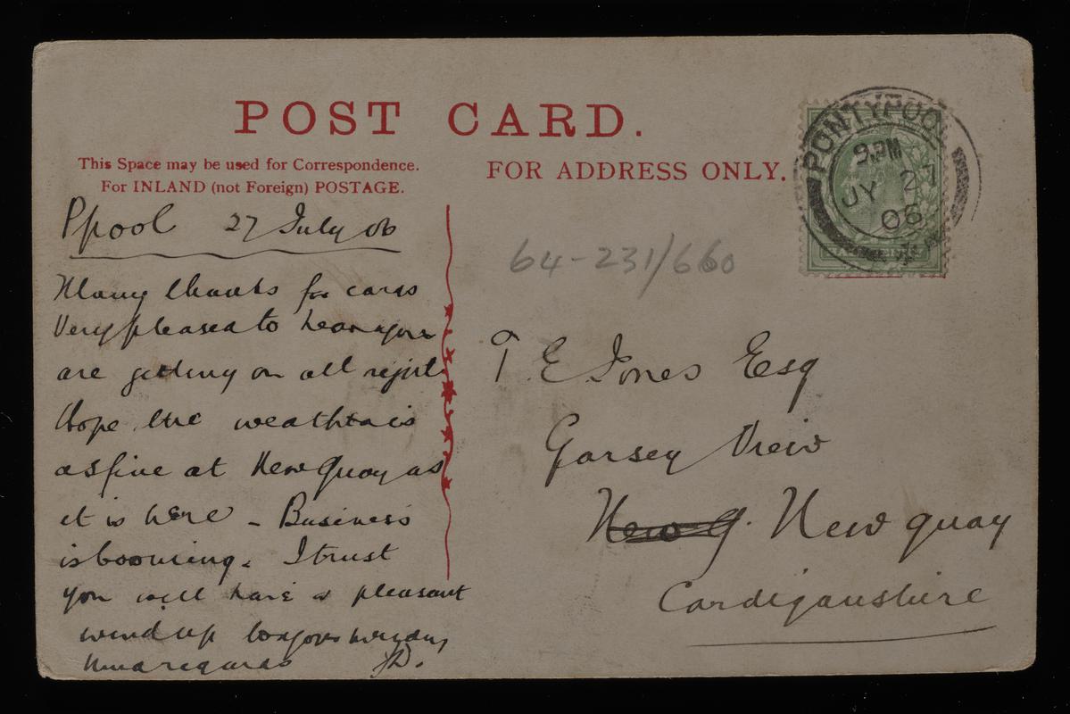 Colour postcard of "Beached". Photographer unknown. Sent to Mrs J.T. Jones of Pontypridd. Postmarked 14 August 1912.