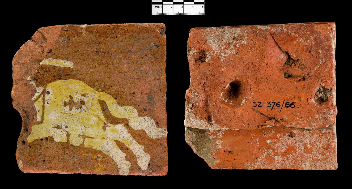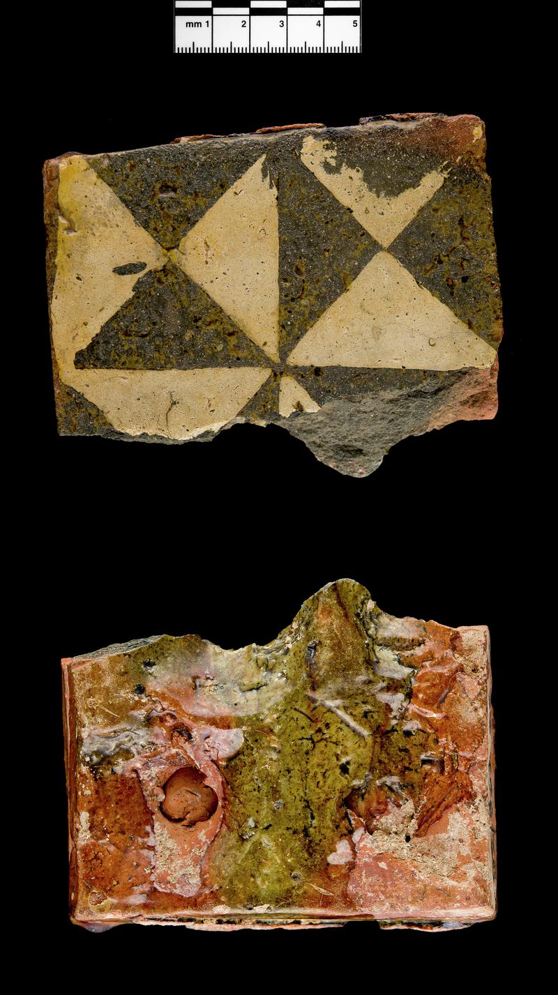 Line-impressed. Continuous design; eight-petalled flowers within circles, with each flower set within a square. Chester: Dom. Friary, Benedict. Nunnery (Rutter 1990, 13/108)