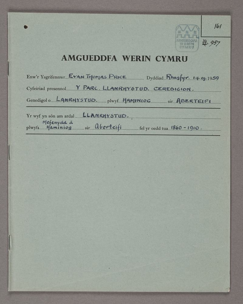 Llyfr Ateb Amgueddda Werin Cymru, 1960, yn cynnwys atgofion E.T. Price, Llanrhystud, am y Nadolig pumdeg mlynedd yn ol. Ceir hefyd brasluniad gan E.T.Price fel rhan o'r nodiadau o hen offeryn i dynnu dannedd.