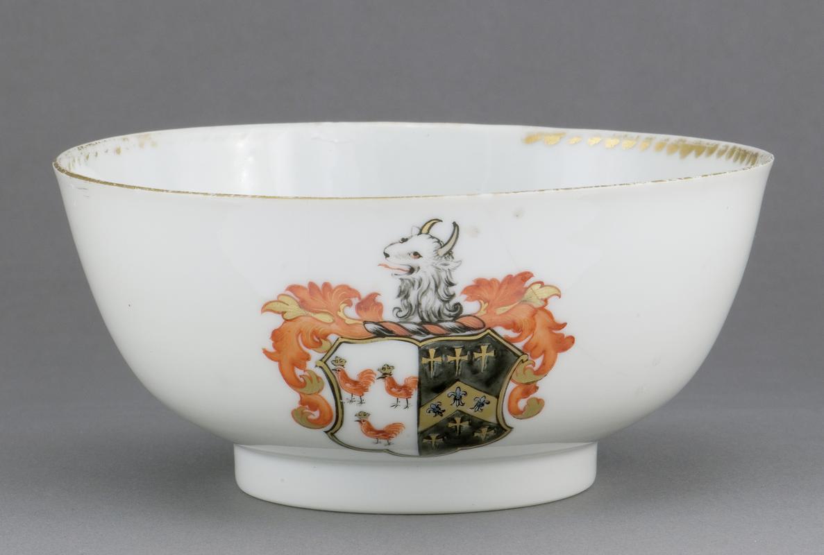 Slop bowl, mixed or duck egg paste, with a pronounced green translucency, standing on a rounded foot rim, tapering outwards to angled sides; the interior decorated with a broad band of underglaze blue with three groups of red and white chrysanthemum heads and gilt foliage and scrolls divided by three oval reserves of flowers on a white ground, apricot border with gilt foliage below into which the underglaze blue flows on one side; the exterior has two pale blue pierced rocks, a bird and other flowers and foliage above an oriental fence