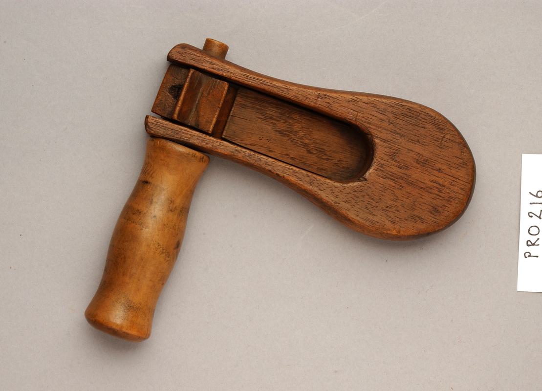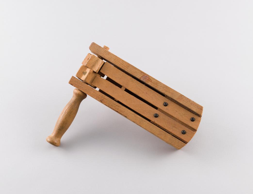 Police rattle used to raise an alarm or summon aid. Used by donor's grandfather, David Davies of Cardiff, in the 1850s. Constructed of wood, with two blades held in a frame and a ratchet turned - to make the blades `snap' thus creating a very loud noise.