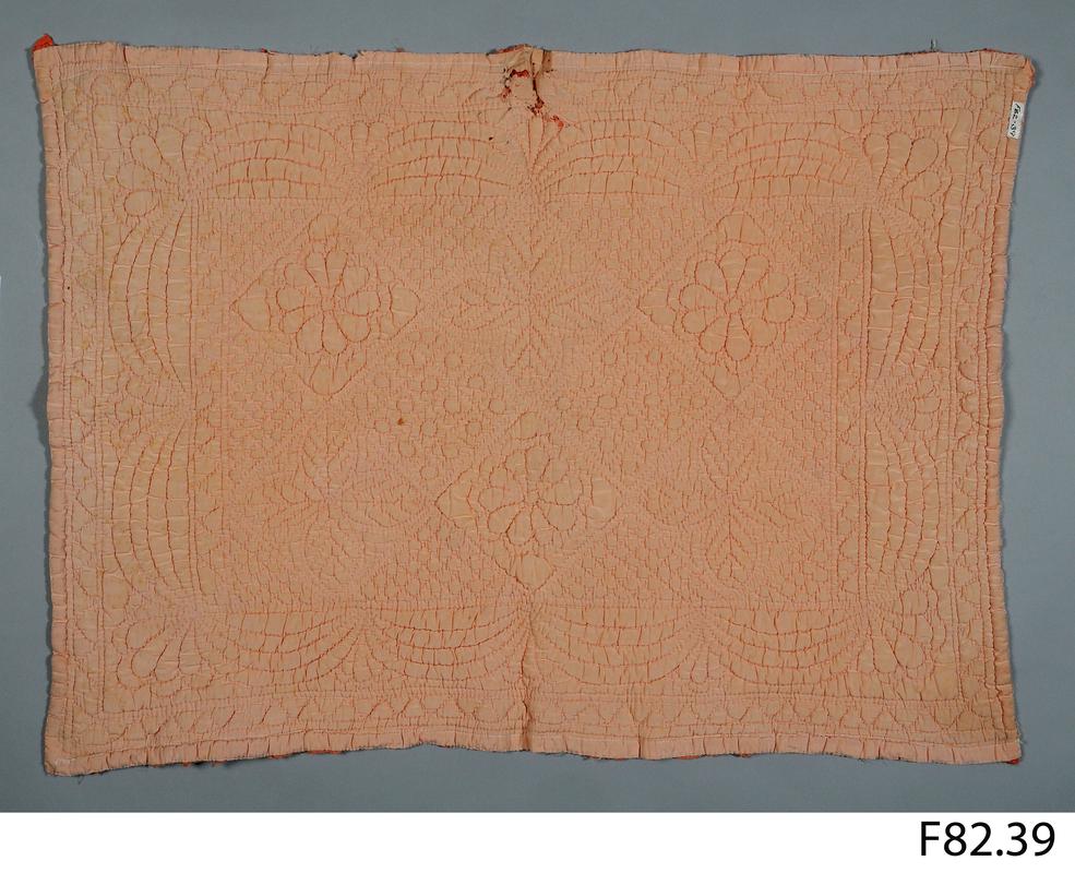 One side is made of pink synthetic satin fabric, the other side of gold. Central motif of an eight petal flower set within a circle, hearts top and bottom, two small four petal flowers on either side of centre, and four leaves in the diagonals. Set against a diamond diaper pattern. All quilting done by hand using pink thread.