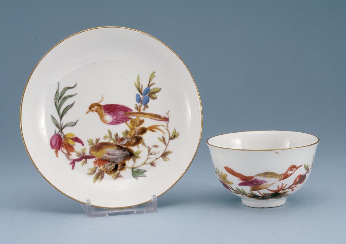 Tea cup and saucer, hard-paste porcelain, cup standing on a foot rim, rounded sides, everted lip, floriate C-scroll handle; painted in polychrome enamels with an exotic bird in blue, brown, yellow, puce and red perched on a branch issuing from stones and bearing blue fruit, another branch with red flowers to right, gilt line at lip, gilding to handle, interior painted with `ermine tail' in green. The saucer, also with a shallow footring, is painted with a long-tailed bird in yellow, red and puce perched on a Y shaped branch issuing from a rock, amid polychrome flowers and foliage.
