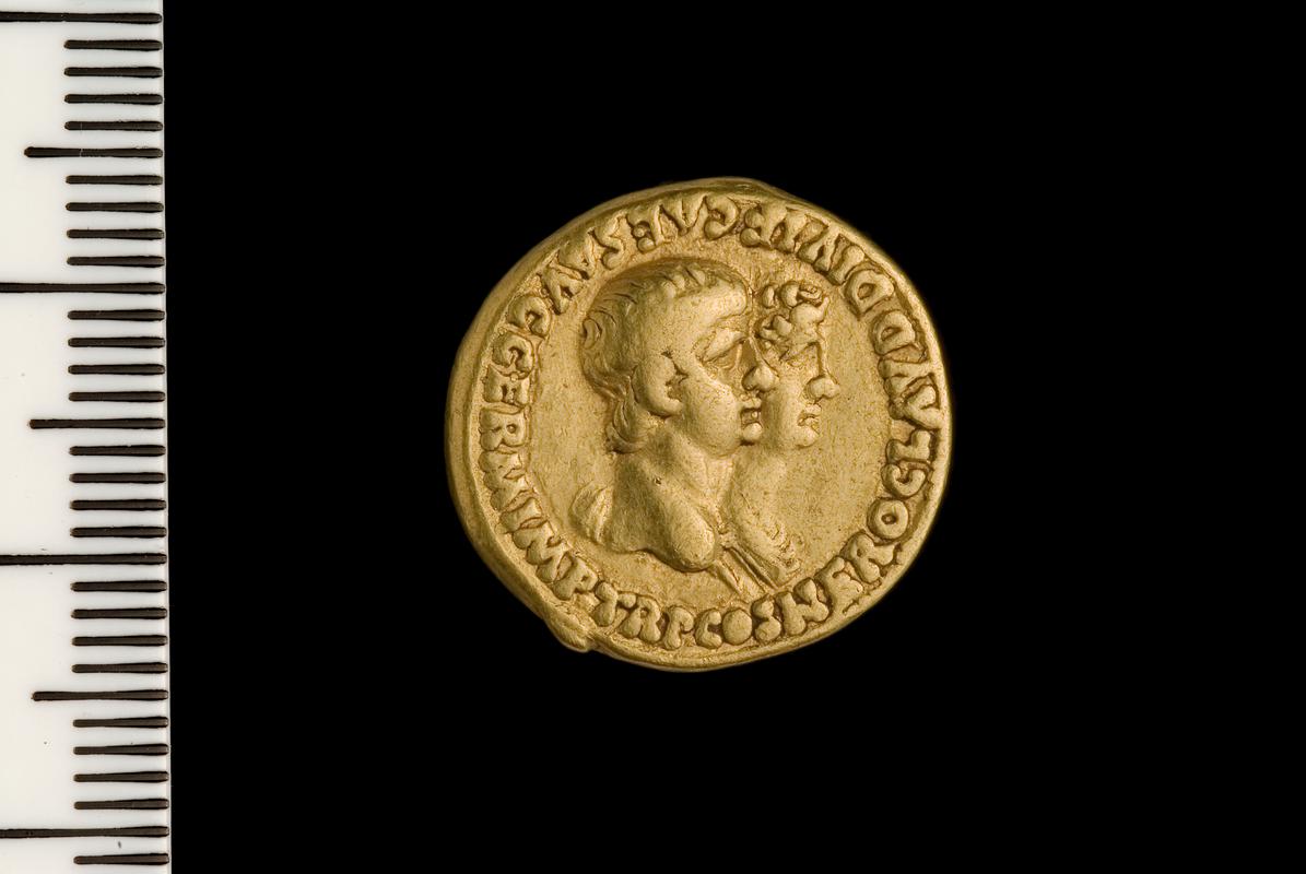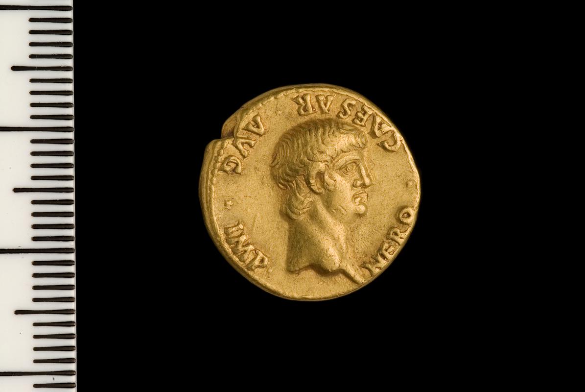Nodiadau: Five aurei found together in Trench II (section C-D) in the lowest Roman layer beneath the black occupation soil of the stone barracks. They were in a hollow in the soil on the side of the trench, 4ft 6in. below the modern surface.