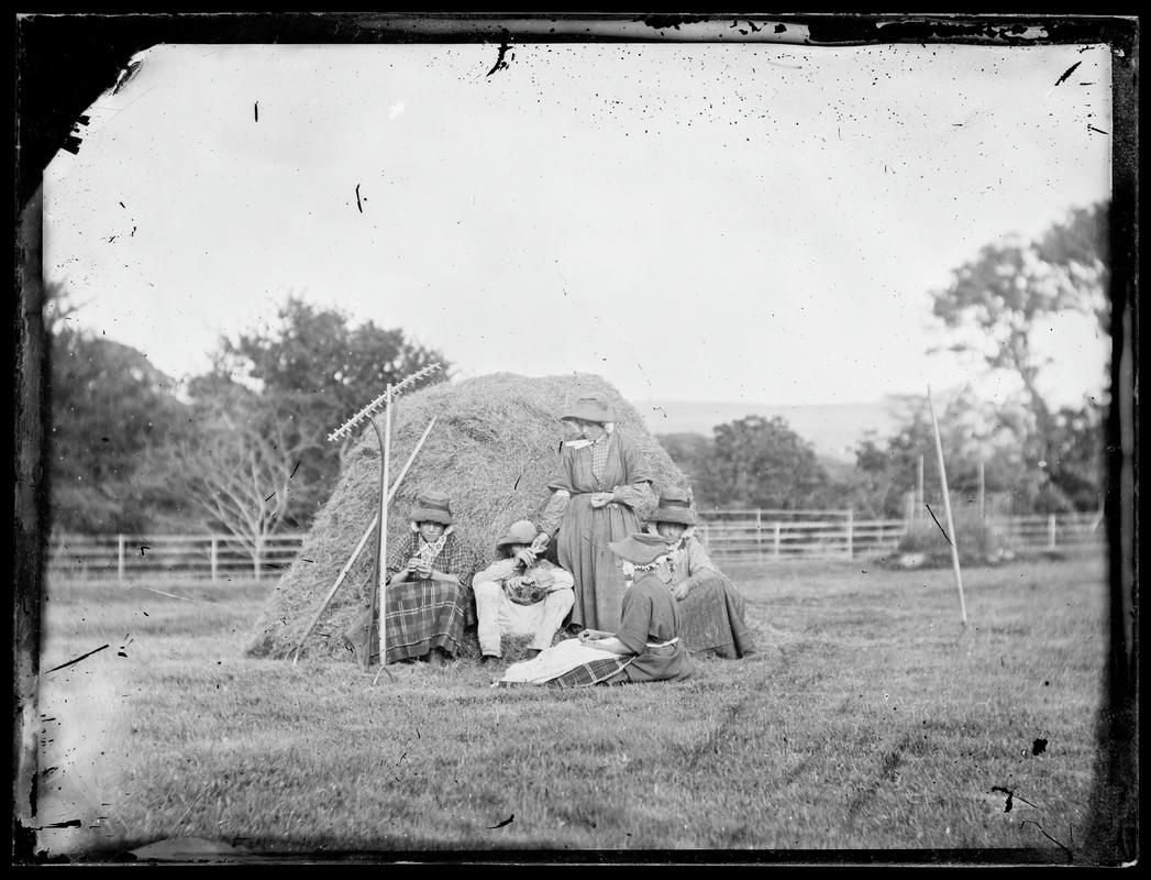 Collodion glass negative showing Emma, Elinor and Lucy hay making.