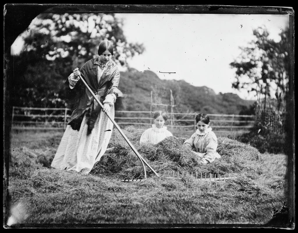 Collodion glass negative showing Emma Charlotte, Elinor and Lucy sitting ouside.