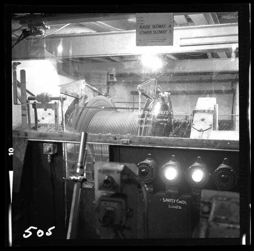 Black and white film slide of a photograph showing a locomotive and coal wagons, Lewis Merthyr Colliery, c.1910.