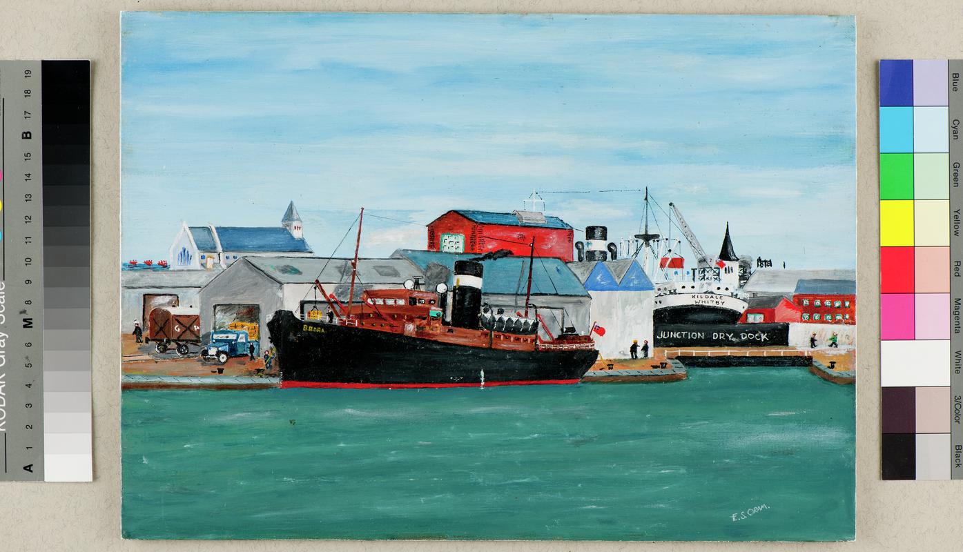 Y llong-deithiwr Harrison yn cael ei llusgo i Queen's Dock, Caerdydd 1950au.