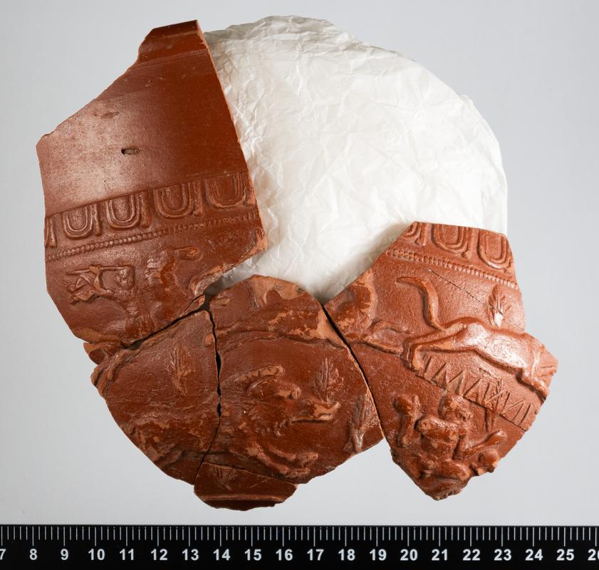 Cinnamus (Cinnamus was a samian potter from Lezoux, creating uniformerly neat, well finished bowls. The magnitude of his production is astonishing; it far exceeds the work of any other samian potter. His work is found widely in Wales, including Caerleon, Brecon, Caerhun, Carnarfon, Caersws, Forden Gaer, Holt, Usk and Carmarthen.)