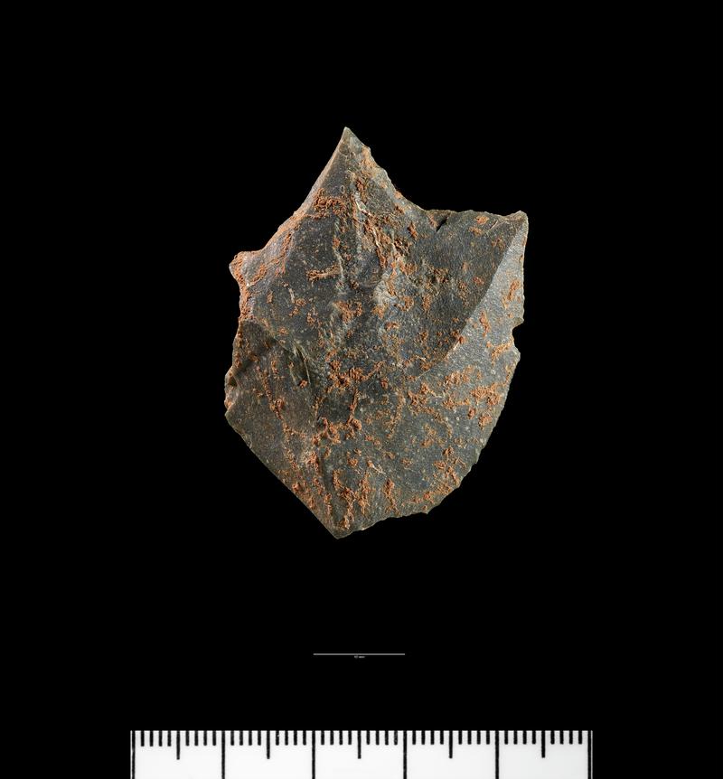The tooth has a single perforation at the end of the root running laterally through the side of the tooth. There are a number of heavy score marks on both the front and the back of the tooth.