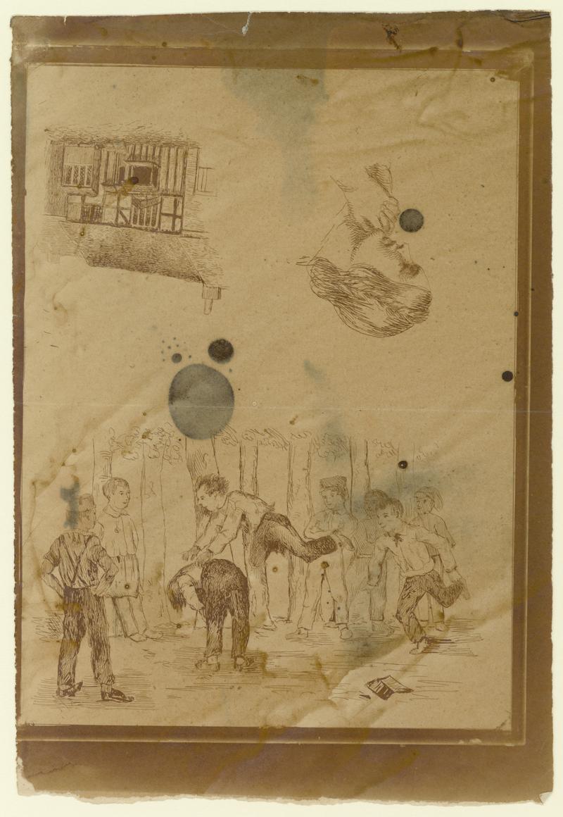 Photogenic drawing showing of two branches of fern (shorter on the right hand side). Negative white image on black background, cut into leaf shape.