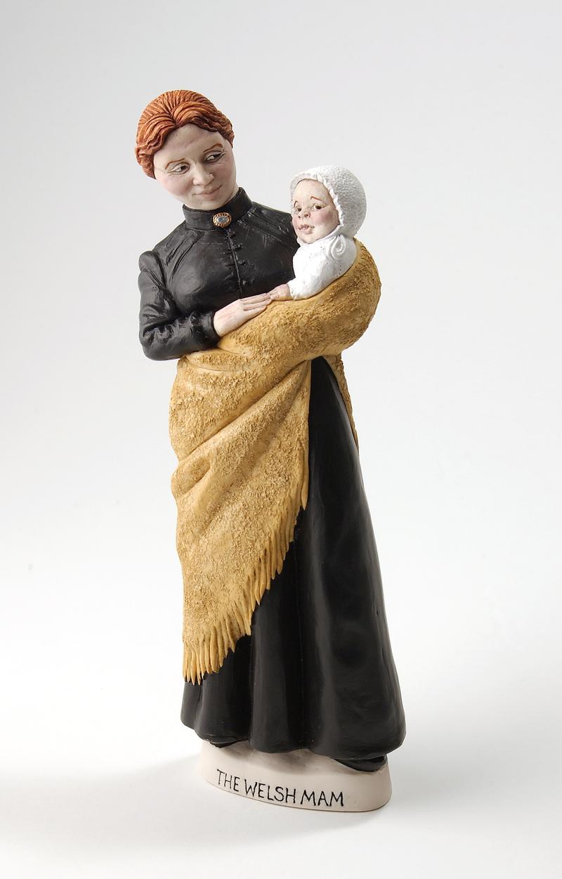 Sculpture showing a miner (carrying lamp and food box) with son (carrying a water jack). Title painted on front of base. Signed by artist on bottom with World of Groggs sticker.