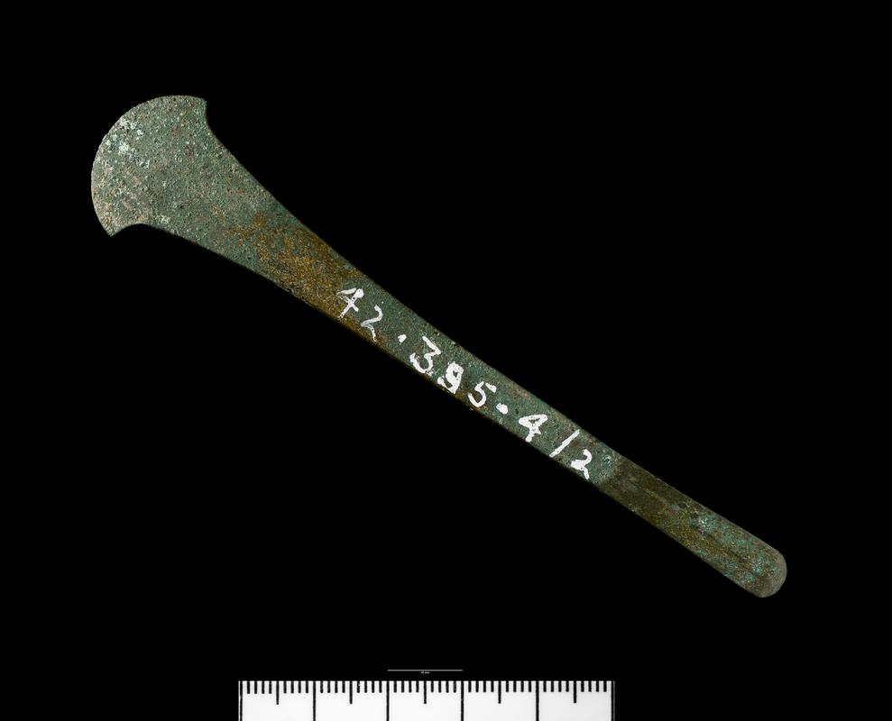 Nodiadau: Found inside the cinerary urn 42.395.4/12 which had been inserted over a secondary cremation burial in the larger of the round barrows at Ty'n-Pwll.
