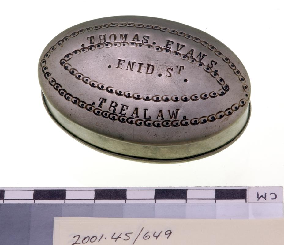 Wooden box with leather carrying strap, for miners dial (2004.113/1). Two manufacturers paper labels stuck inside lid.