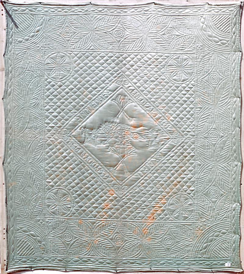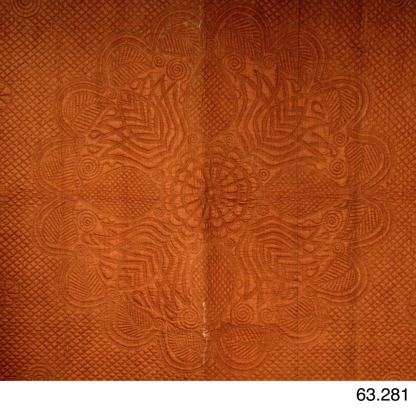 Wholecloth quilt made in about 1860 by Mrs Elizabeth Rosser of Dowlais. Plain brown top, reverse of dark green. Quilting pattern consists of a central circle with a heart motif on two sides and six circles on the other. Broad border with a series of semi-circular fans and diamonds on outside.