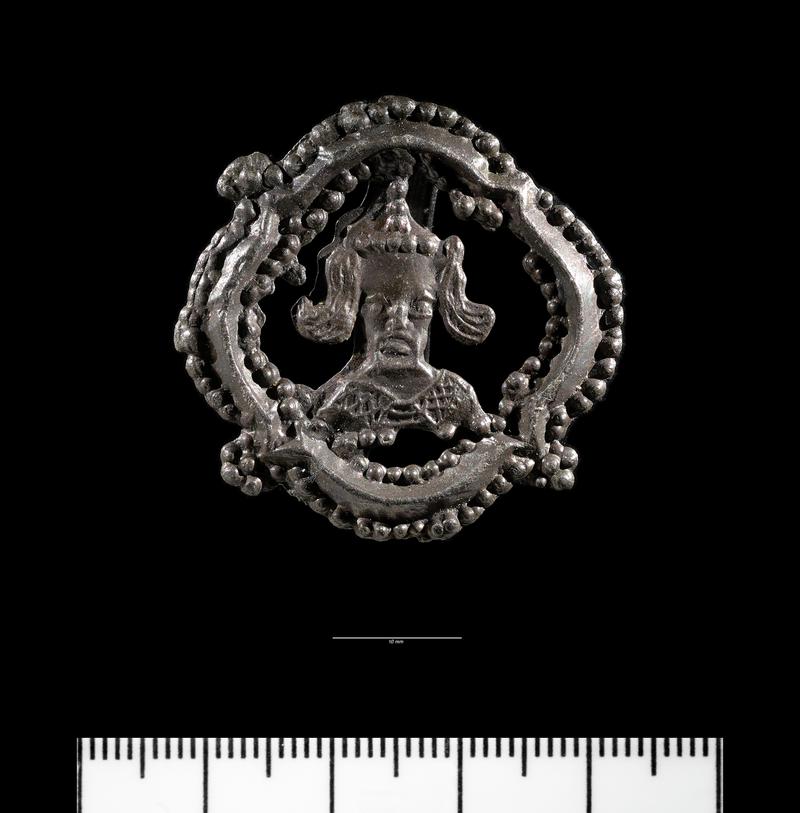 The badge is in the form of an openwork roundel, with the figures of the Virgin and child at the centre. Mary is seated holding the infant Christ and both figures are haloed. The roundel surface is decorated with repeated patterns of circled knops, large rounded pellets and possible quatrefoils , connected by a single 'thread'.The outer edge of the roundel is decorated with a cabled twist along the edge. Semi-circular attachement lugs project from each side of the badge.