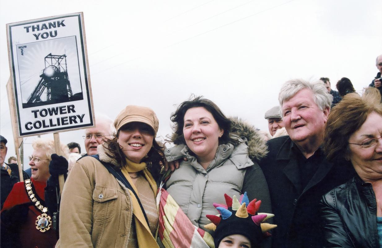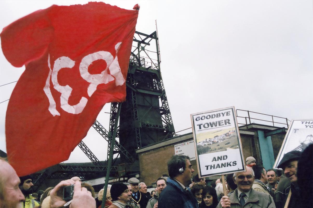 Closure of Tower Colliery, Hirwaun, showing general view of the crowd in front of the pit's headgear, with red flag painted with '1831' at left.