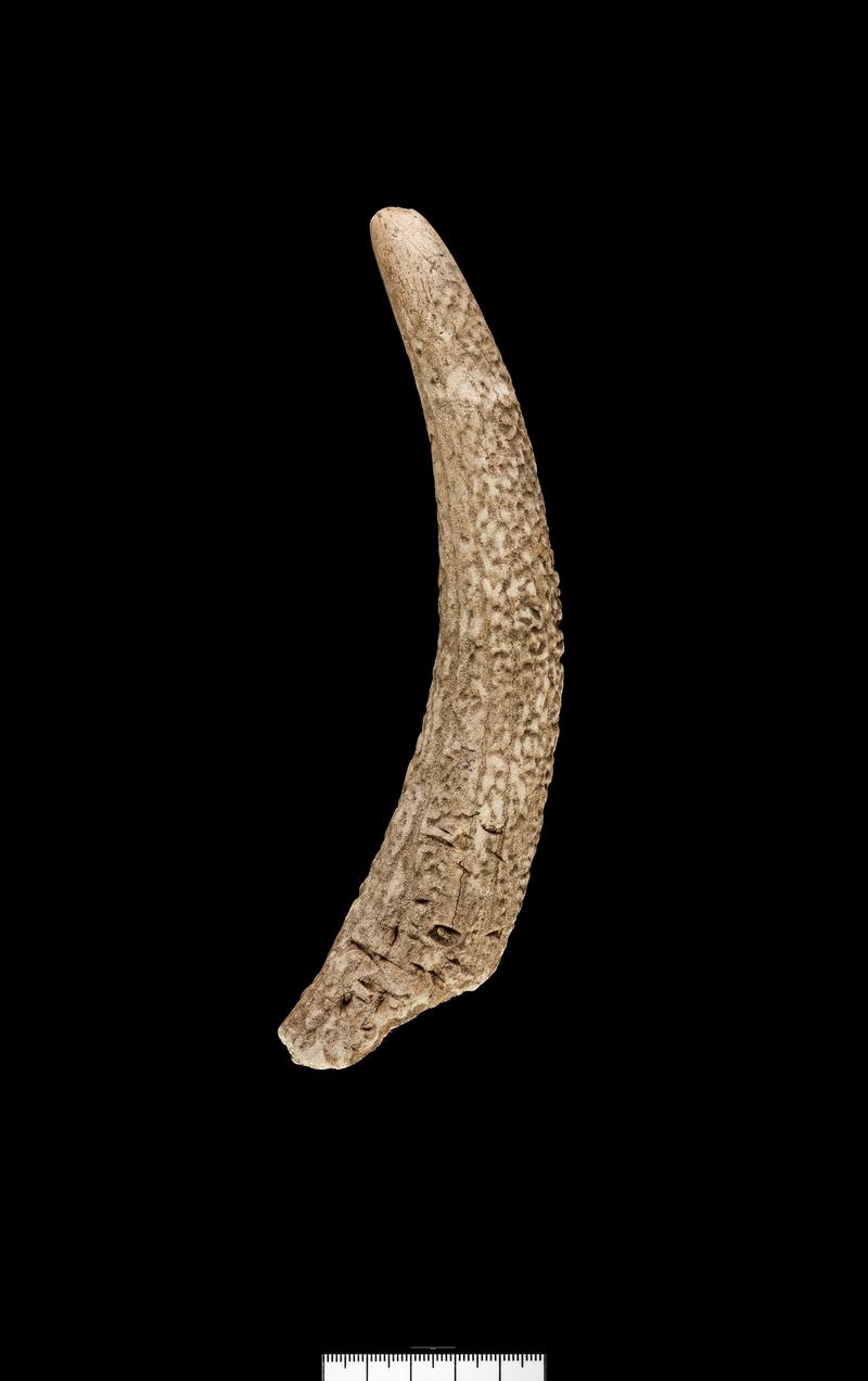 shop knife; short steel blade worn to angled tip; tanged and ferruled into short, turned, bulbous wooden handle
