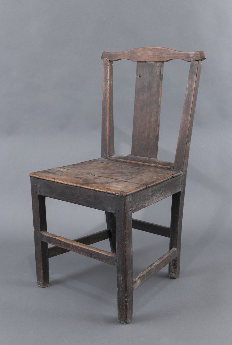 Bentwood chair with long, curved legs, circular stretcher and circular solid seat with stamped design. Traditional style back with bentwood side supports.
